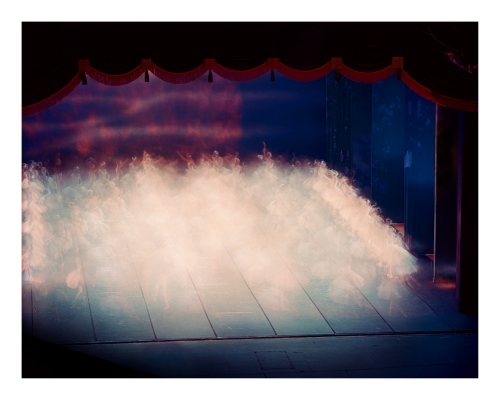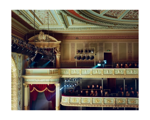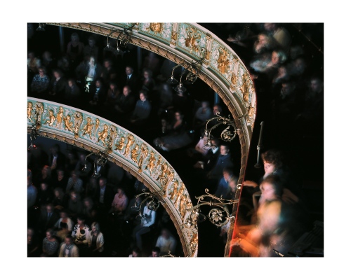 In one image Vaivode shoots looking down from the balcony on the red velvet curve that separates the orchestra pit from the stalls. The marked contrast either side of the line, one of light activity against dark observation, puts us in mind of Plato’s cave or Debord’s Society of the Spectacle, as those in the dark sit transfixed by the energy of others – passion by proxy. And yet the work is less social critique than affective visual feast as the audience is drawn into the play.